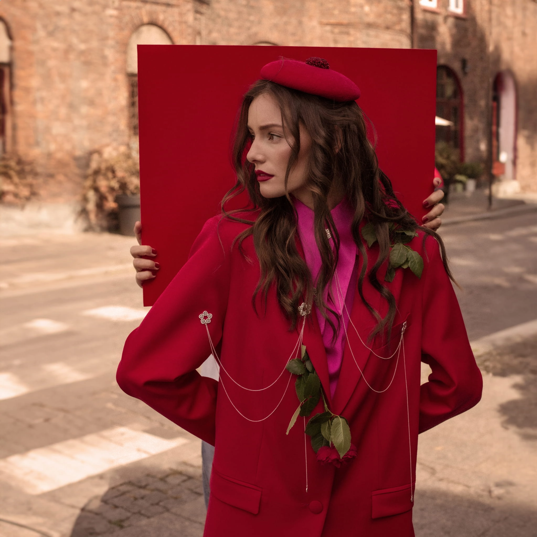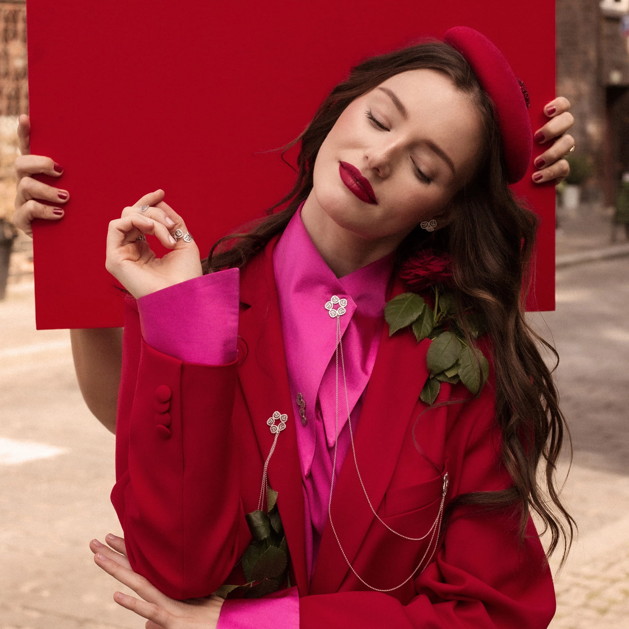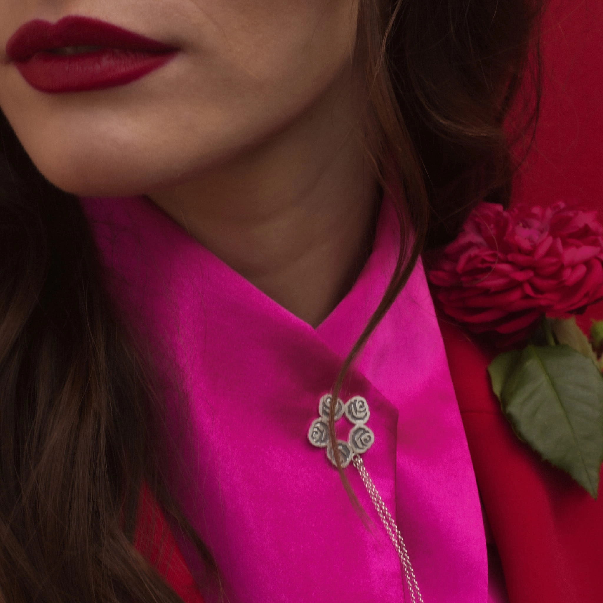 Broszka, której dwa elementy przypinamy do ciuchów i które połączone są ze sobą srebrnymi łańcuszkami, dzięki czemu dają nam sporo możliwości stylizacji i zabawy ta formą.