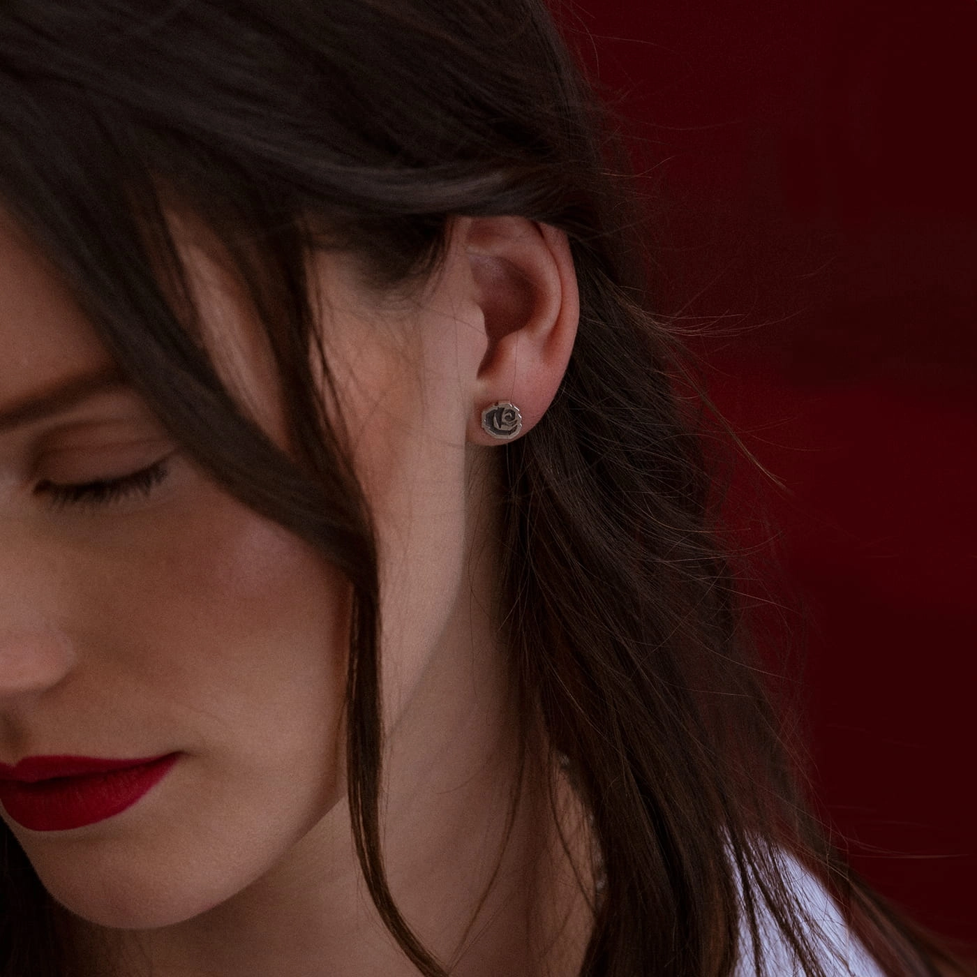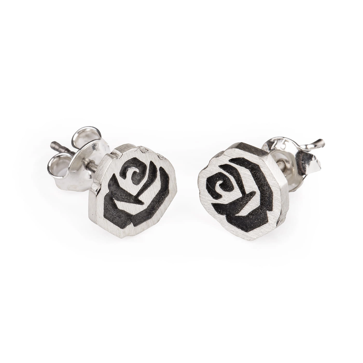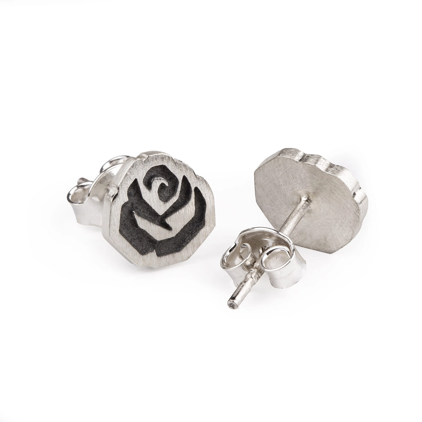 Kolczyki dwie Róże to jedne z najdrobniejszych wzorów w kolekcji inspirowanej mozaiką z Katowickiej górniczej dzielnicy - Nikiszowiec. Kolczyki wykonane zostały z oksydowanego srebra próby 925.